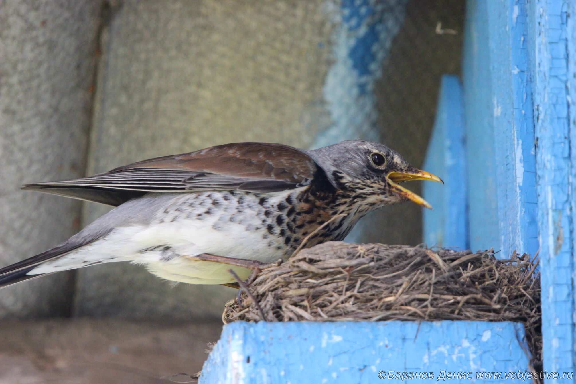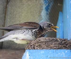 Дрозд-рябинник кормит птенцов