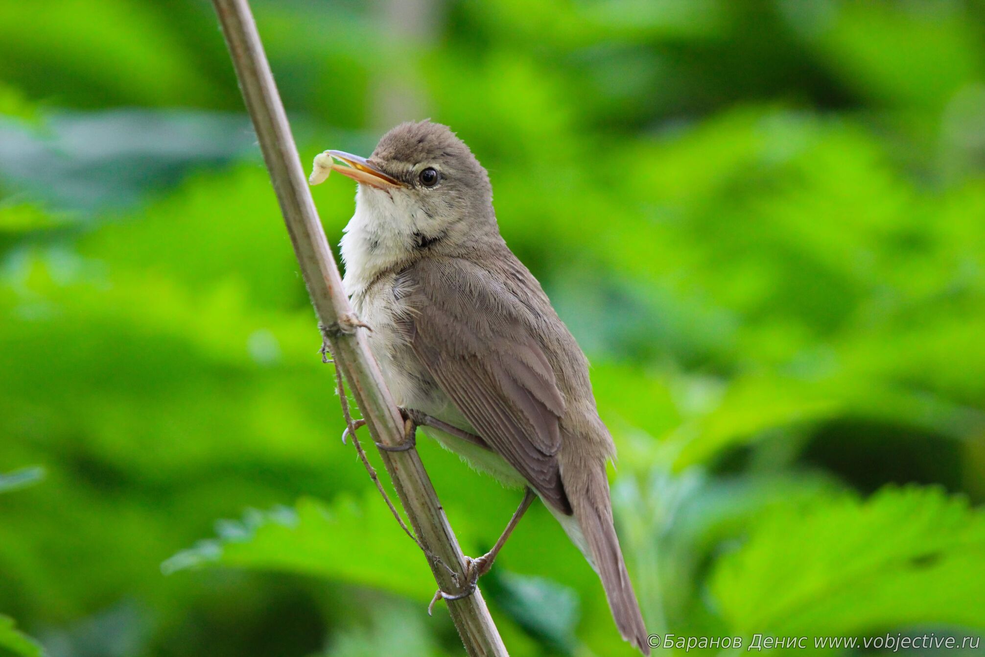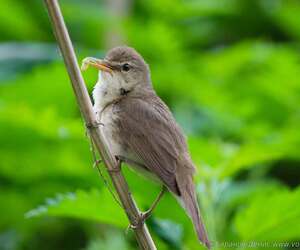 Камышовка садовая с кормом в клюве