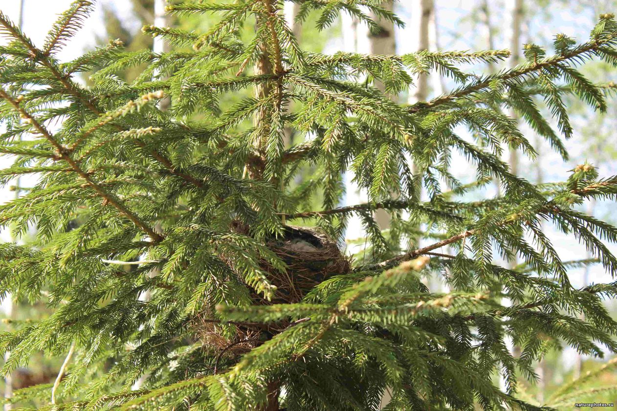 Гнездо дрозда-рябинника на елочке в берёзовой роще. Снято в Талдомском районе МО, май 2023.