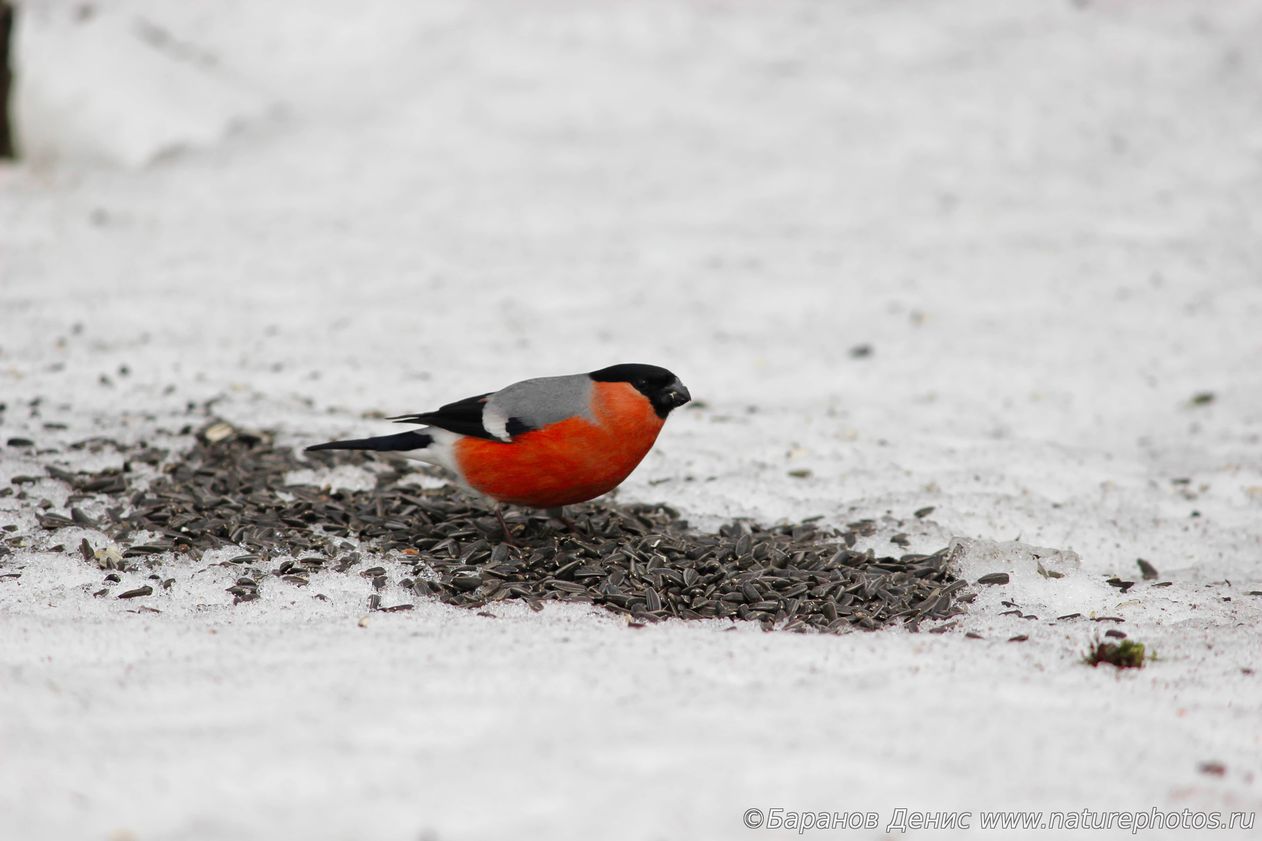 Самец снегиря под кормушкой в ГБС, март 2024